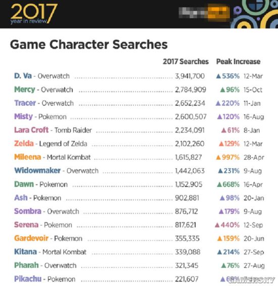 成人网站2017热搜游戏角色榜:DVa第一皮卡丘入榜2018-04-29游戏角色名
